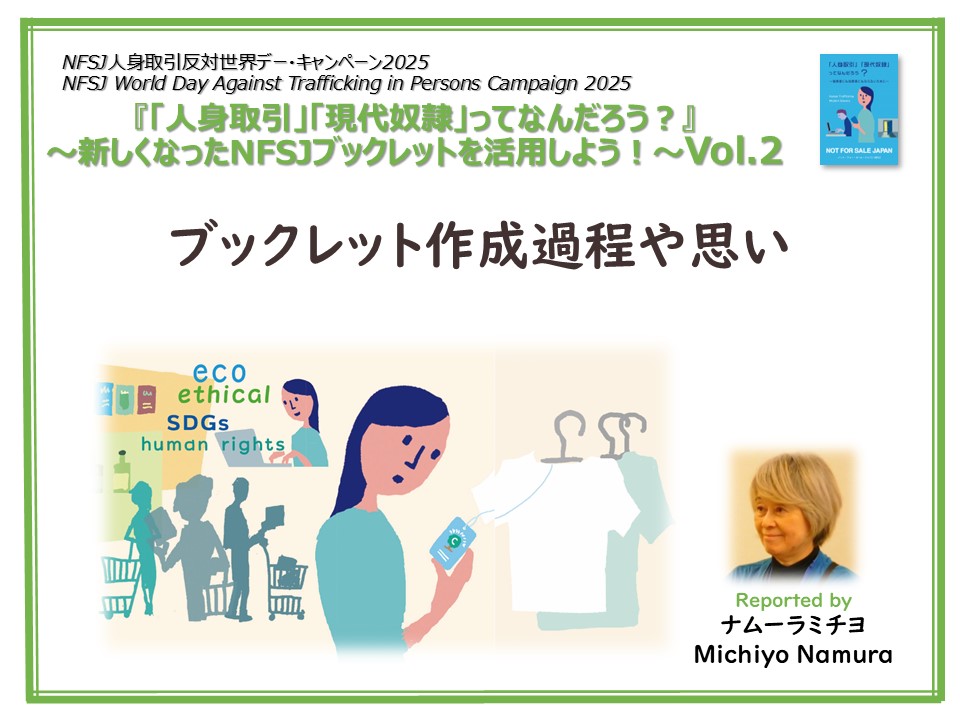 NFSJでは人身取引・現代奴隷問題について多くの方に知っていただこうと、新しくブックレットを作成しました(A5判16ぺージ)。下の画像をクリックすると、本のように読むことができます。